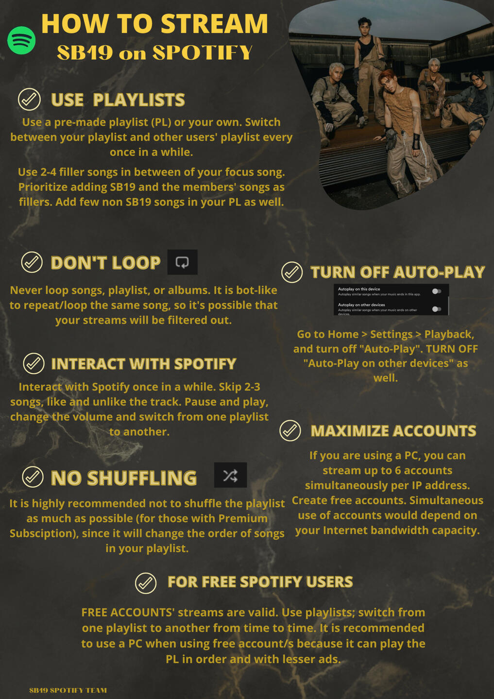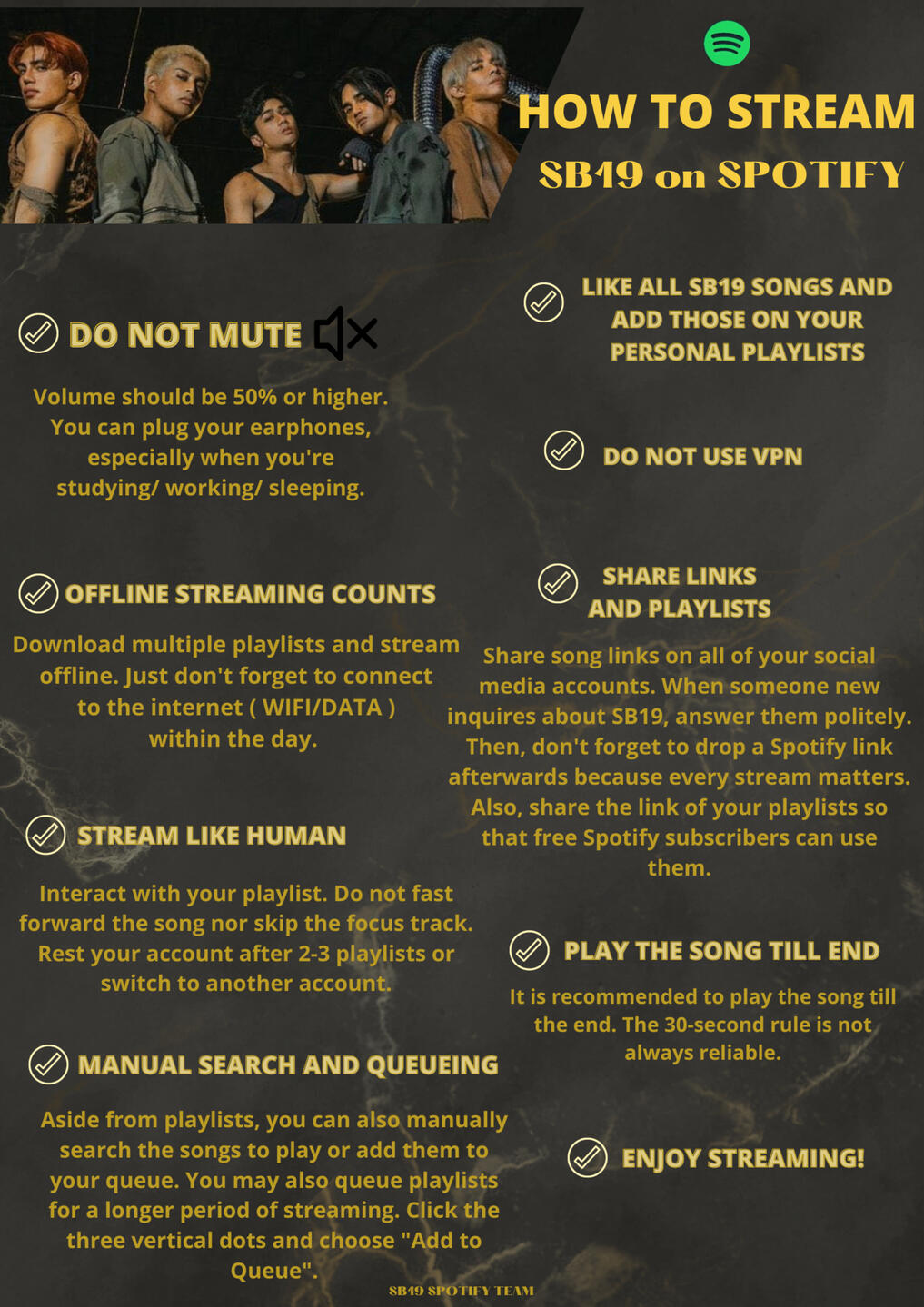 SPOTIFY is one of the world's largest audio and media services provider. It allows users access millions of songs, podcasts, and content from artists across the globe. By streaming SB19's tracks/ album on Spotify, their songs can be added to major playlists/charts with thousands or even millions of followers which means the group can be heard by a larger audience. Furthermore, Spotify pays royalties based on the number of streams that will help the group.